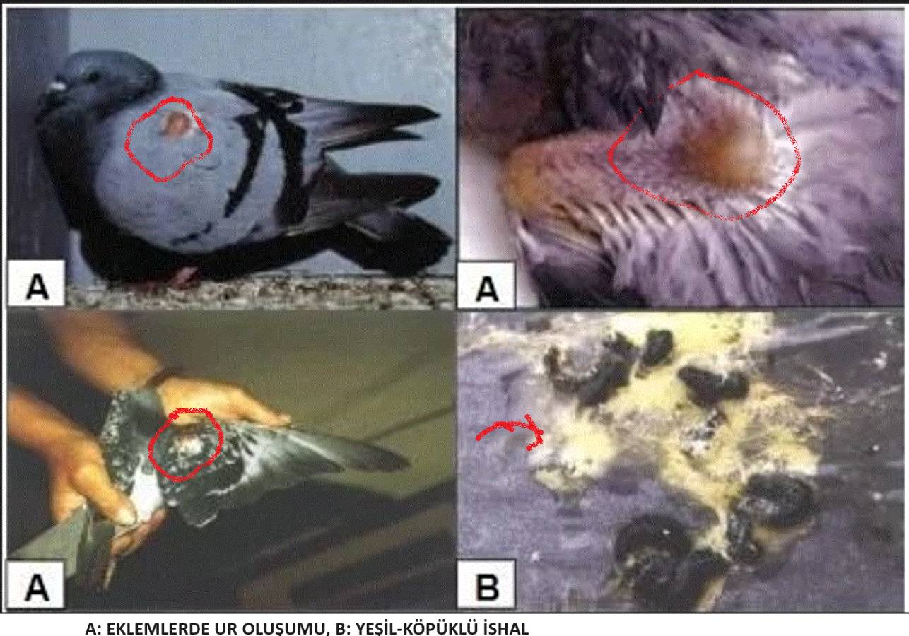 GENEL ENFEKSİYON BELİRTİLERİ: Güvercin yalnızlaşır, kümesin kuytu olan ışık almayan kısmına çekilir. Yeme, suya ve dış etkenlere (ses, ışık vs ) karşı tepkisizleşir. İştahsızlık, tüy kabartma ve karışık tüyler gözlenir. Titremeler, kilo kaybı, gerginlik hali oluşur. Güç ve performans kaybı, uçmada isteksizlik gelişir.